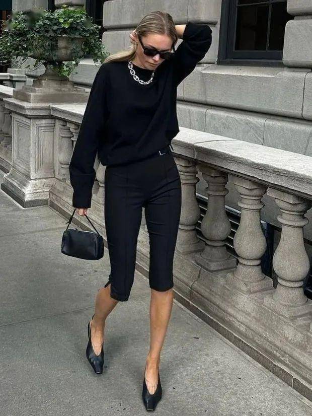 🔸 纯色卡普里裤(黑色紧身款)+ 正装衬衫