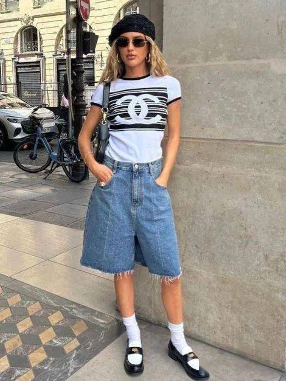 🔸 牛仔五分裤 + T 恤(宽松款)