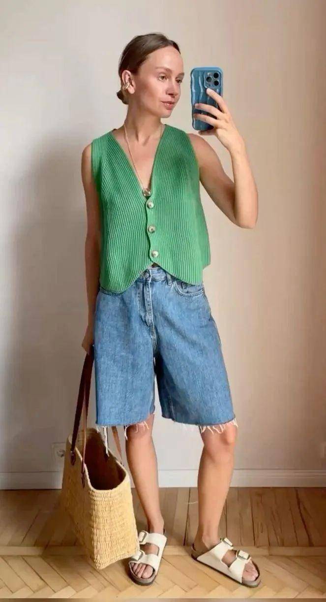 裤子选 “磨白毛边款”,马甲选 “米色短款”,内搭条纹长袖(袖口卷边),配帆布鞋 —— 叠穿的层次让五分裤更有看点,美式复古中带着点文艺,适合春秋过渡穿。