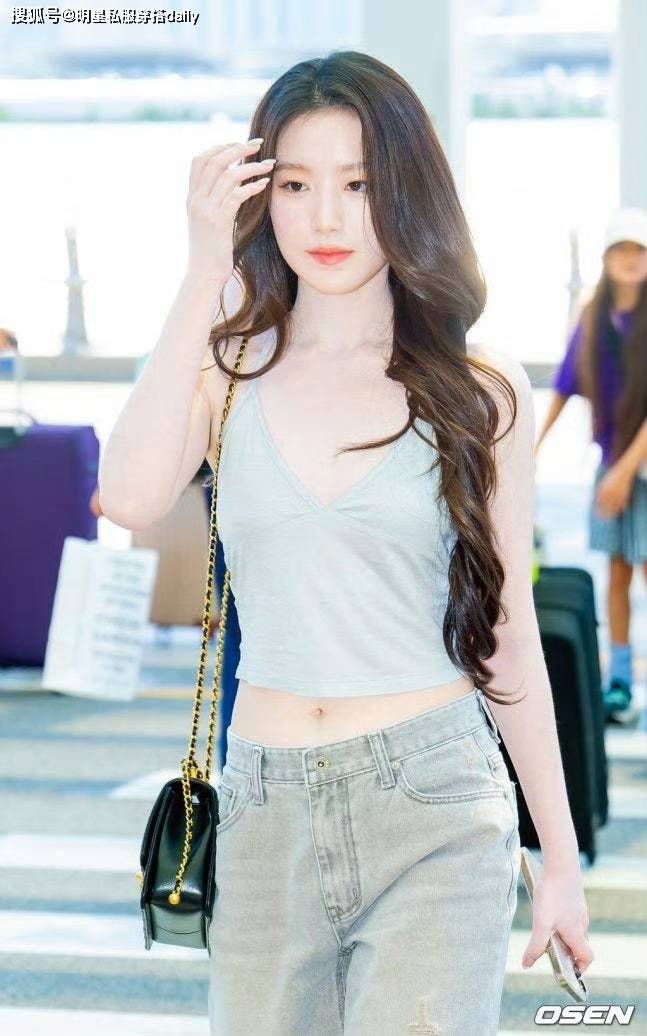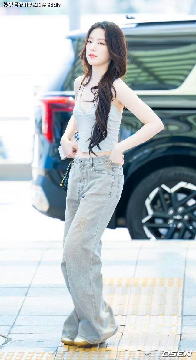 如果说挂脖吊带负责「仙」,那破洞牛仔裤就负责「潮」。叶舒华搭配的做旧复古款破洞牛仔裤,用磨白的水洗质感和恰到好处的破洞设计,中和了吊带的柔美,多了几分随性不羁的街头感。而高腰的版型更是藏肉显瘦的利器,轻轻一拉就能露出纤细小蛮腰,轻松打造「上短下长」的黄金比例,让腿长在视觉上直接翻倍。