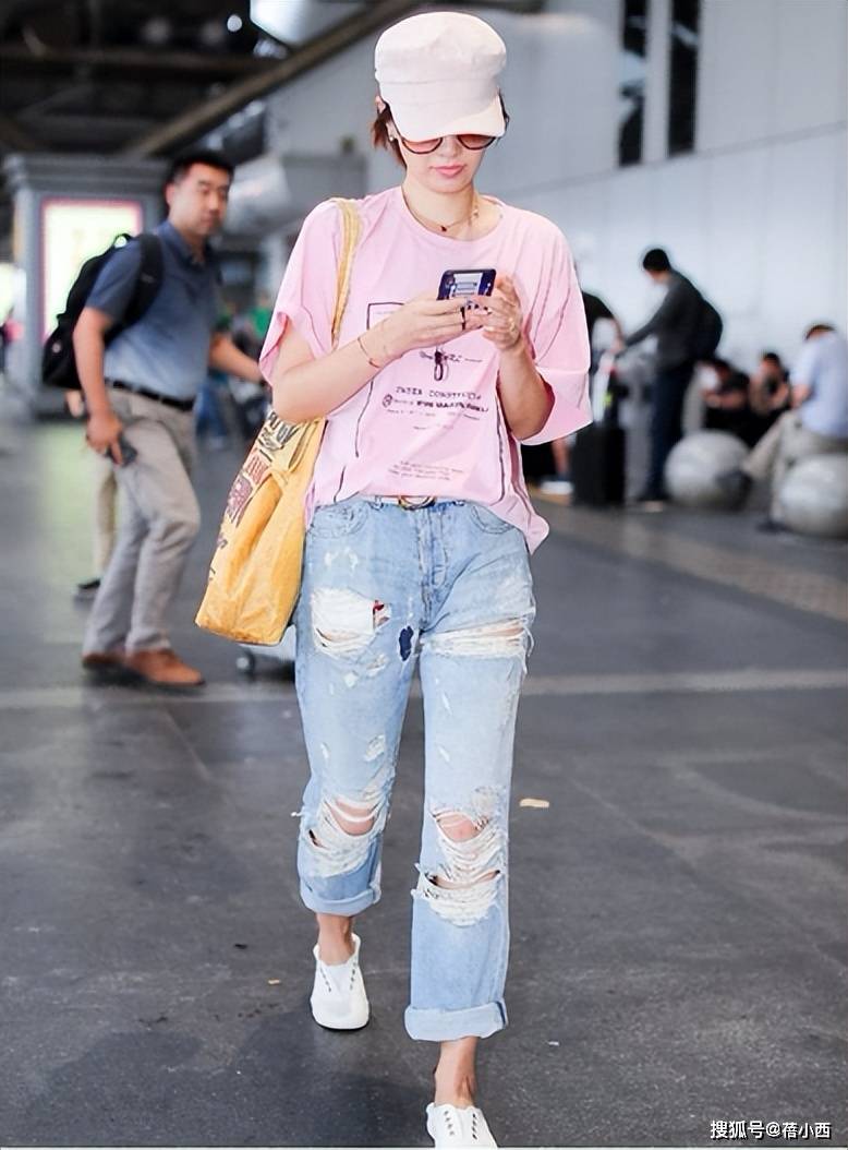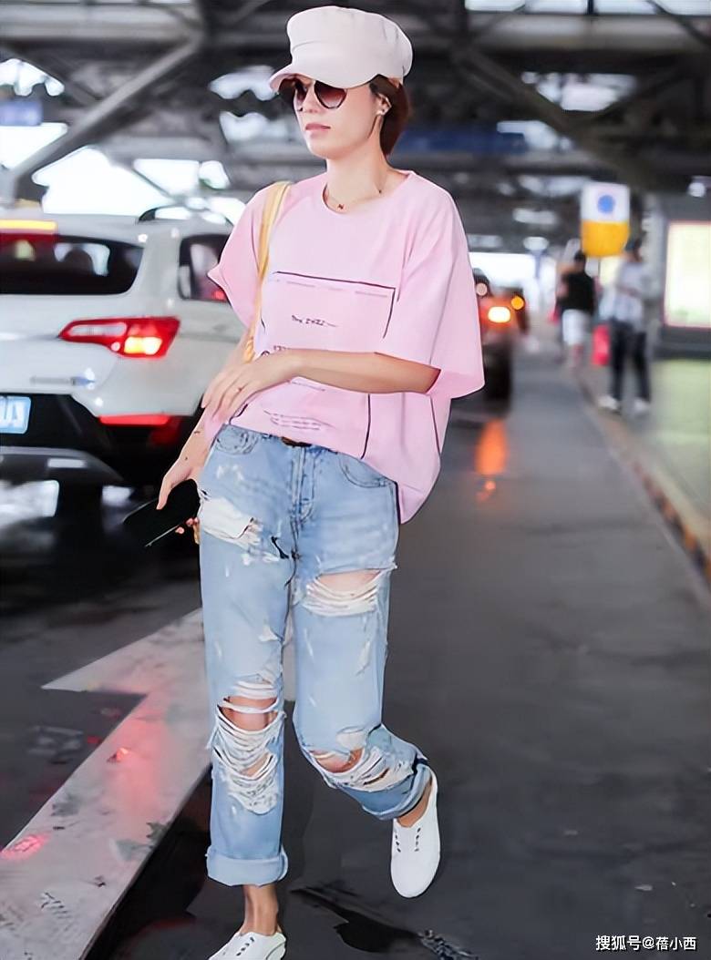 原创 “马伊琍”又把机场穿成秀场!穿粉T+破洞牛仔裤,48岁美出新高度
