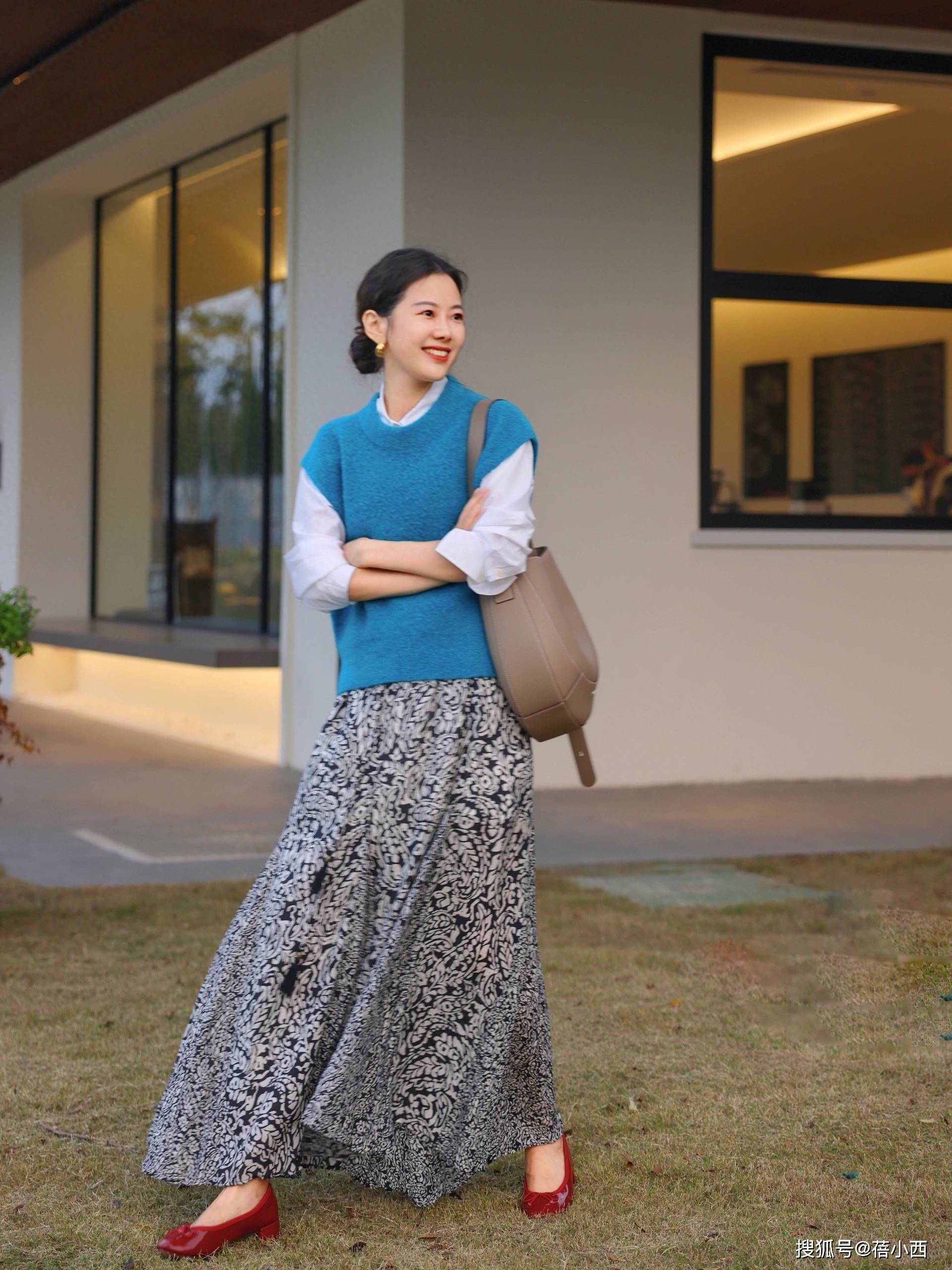 秋风送爽,是撞色搭配最美的季节。白色衬衫与湖蓝色针织衫的组合,再搭配一条印花长裙,足下踩一双红色芭蕾舞鞋,仿佛在浪漫的草地上,踏出了一个个动人的音符。每一步都透露着轻盈与优雅,让人不禁停下脚步,欣赏你的风采。