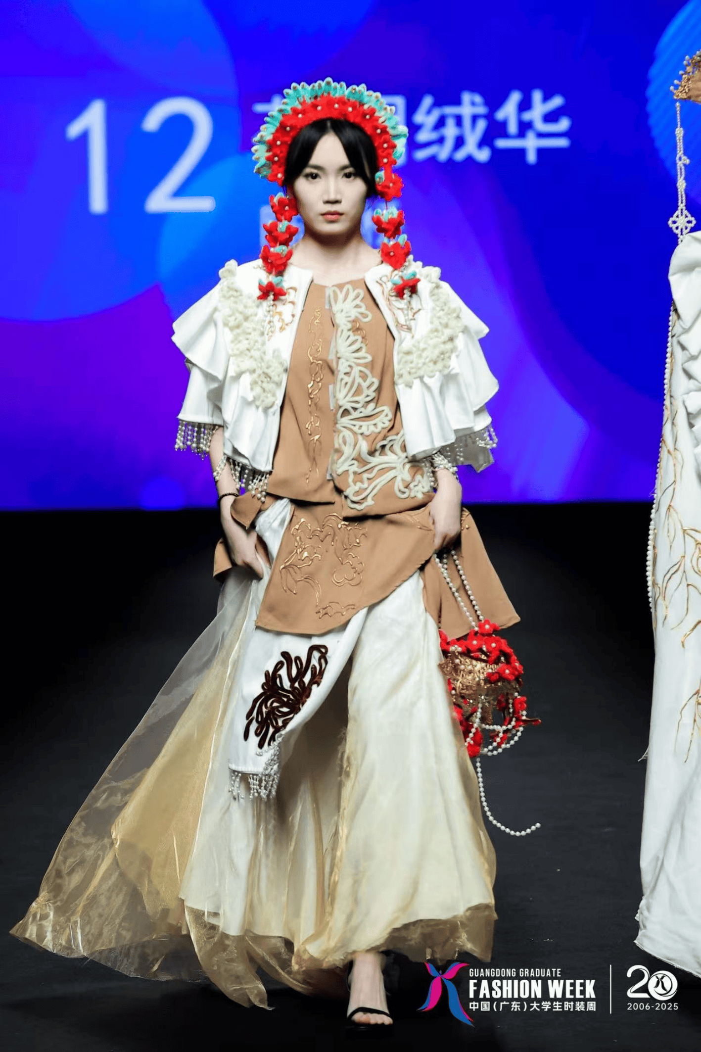 在“花朝绒花”系列作品中,00后设计者陈楚桥以濒临失传的南京绒花为灵感源泉,将绒花的色彩、形式美感、意境和情感转化为更易传播的服装设计语言。