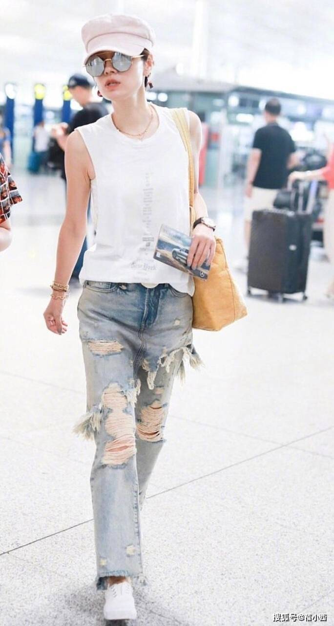 其次,破洞牛仔裤配白鞋是最佳选择,否则很容易给人脏脏的邋遢感。